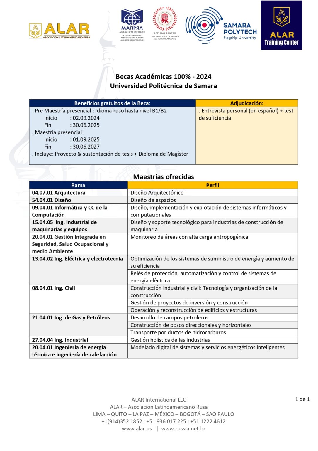 Mayor información de los programas de la universidad SamGTU, precio anual de estudios, costo de vivienda, seguro médico, alimentación puede obtenerla tomando contacto con ALAR